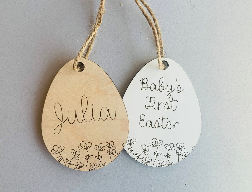 Personalized Easter Egg with laser engraved name or baby’s first easter and design. Available in maple or white. Comes with twine to attach to basket.
