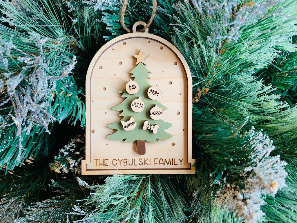 New this year, our adorable family Christmas tree ornament. This ornament is made of two layers of 1/8th maple plywood measuring 4.6x3.5 inches. Each ornament can be personalized with names. Cat and Dog ornaments included.